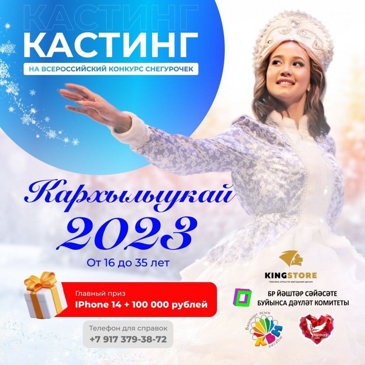 Главный приз — IPhone 14 и 100 тысяч рублей Конкурс башкирских Снегурочек «Кархылыукай - 2023» объявляет кастинг во взрослой и детский номинациях. Для участия во взрослой номинации приглашаются девушки от 16 до 35 лет. Как сообщили «Башинформу» организаторы, главный приз — IPhone 14 и 100 тысяч рублей. Также обещан богатый призовой фонд среди поощрительных номинаций. Финальное шоу пройдет в формате мюзикл-шоу новогодних каверов с участием звёзд эстрады. Для участия в детской номинации приглашаются девочки в возрасте от 5 до 15 лет. Девочки участвуют в съёмках короткометражного новогоднего фильма с премьерным показом в день финала. Всероссийский конкурс башкирских Снегурочек проводится с 2021 года и является одним из любимых бьюти-шоу от студии-организатора таких крупных конкурсов красоты, как «Башкортостан гузэле», «Красавица Уфы», «Юная красавица России — Башкортостан», «Хылыукай». Гузелия Миндиярова