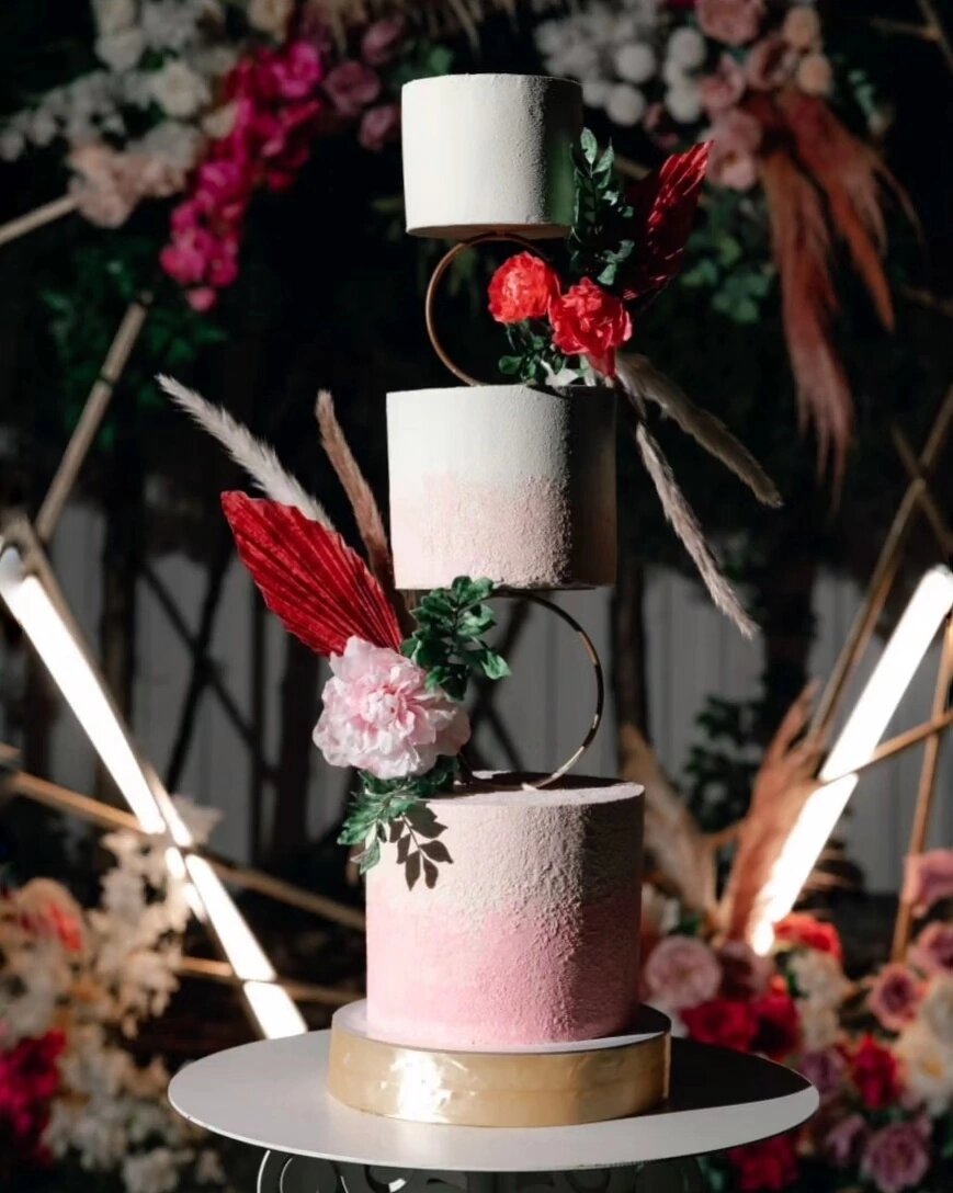 Свадебный торт с межъярусами кольцами. Мы везли его разобранным на 2 части за 90км от дома. Собирала на площадке. Вес самого торта около 9кг, общая высота 75см. Это самый стрессовый торт за всю мою практику. Так как не всё зависит от тебя и было ощущение, что кольца не выдержат, хоть он и был укреплён по всем правилам. Слава Богу, всё прошло прекрасно. Посмотрите, какие волшебные фотографии получились! И жених с невестой просто потрясающие! Но даже после того, как невеста мне написала, что его благополучно съели и гости подходили, говорили, как было вкусно, я несколько ночей не могла уснуть представляя параллельную реальность. Что, если бы кольца не выдержали🥺. Я понимаю, что не первая делала подобный торт и кольца покупала у профессионалов, но больше не возьмусь за такую конструкцию. Лучше полагаться на себя. Когда ты сам создаёшь всё с нуля - пилишь шпильки, крутишь гайки 🔩. Это прибавляет уверенности, что торт выдержит и перевозку, и фотосессию. Хотя может это я сейчас так дума