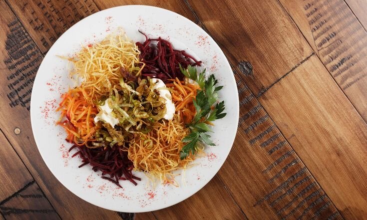 Салат "Чафан" классический — этот салат из разнообразных ингредиентов, которые не смешиваются между собой. Поэтому каждый может сделать салат на свой вкус, положив к себе в тарелку что-то по вкусу. Ингредиенты : -картофель 2 шт -говядина 300 грамм -лук репчатый 1 шт -свекла 1 шт -морковка по корейски 150 грамм -масло растительное 4 ст ложки -зелень (укроп ,петрушка ,зеленый лук ) 1-2 пучка -майонез 200 грамм -уксус столовый 3 ст ложки -сахар -соль Приступим к приготовлению : 1.Первым делом вымойте свеклу и положите ее в кастрюльку. Залейте водой и поставьте на плиту. На медленном огне варите свеклу до полной готовности, затем очистите ее от кожуры и натрите на крупной терке. По желанию, можно нашинковать свеклу овощерезкой. 2.Репчатый лучок очистите и нарежьте полукольцами или немного мельче. Чтобы избавиться от характерного запаха и слишком горького вкуса, замаринуйте его в ста миллилитрах воды с добавлением уксуса, соли и сахара на 20 минут. 3.Теперь черед мяса. Говя