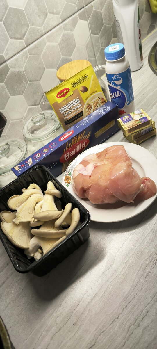 Ингредиенты: Куриная грудка - 2шт Спагетти - 1 пачка Сливки 20% - 250мл Плавленый сыр - 3шт (маленькие) Грибы вешенки или шампиньоны - 200гр Приправа маги - 1шт Соль, перец по вкусу Приготовление 1. Грибы промываем. Нарезаем куриную грудку и грибы кубиками. 2.Грудку перекладываем в сковороду и тушим 2-3 минуты, добавляем грибы тушим пока не выпариться вода. 3.Ставим кастрюлю с водой солим и ждём пока закипит, когда вода закипела отправляем спагетти варить минут 10. 4.Когда выкипит лишняя жидкость добавляем сливки, сыр, приправу, соль. Тушим до готовности на медленном огне. 5.Готовые спагетти добавляем в готовую грудку, всё тщательно перемешиваем. 6.Наша паста с куриной грудкой и грибами готова. Приятного аппетита.