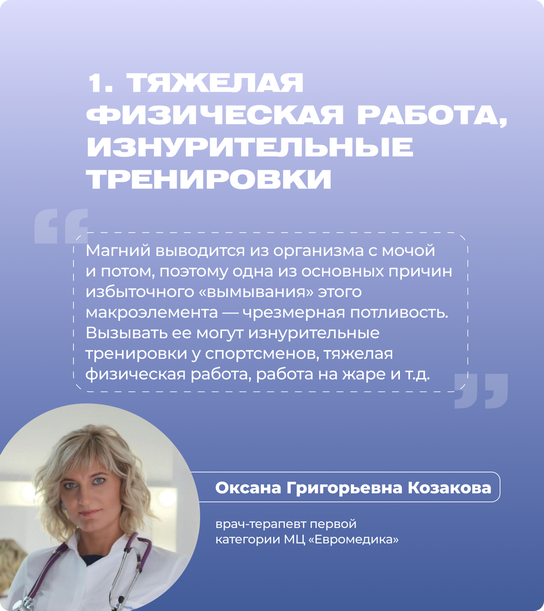 Дефицит магния в организме сопровождается серьезными симптомами: нарушение ритма сердца, боль в сердце, спазмы и судороги мышц, парестезии, диарея, тошнота, рвота, снижение аппетита, раздражительность, утомляемость, бессонница, тревога и снижение концентрации внимания, а также ухудшает течение хронических заболеваний — например, сахарного диабета, предупреждает врач-терапевт Оксана Козакова. По словам доктора, причин дефицита магния может быть по сути только две: 1. недостаточное поступление в организм; 2. избыточное выведение из организма. Сегодня разбираемся со второй. Что способствует «вымыванию» магния из человеческого тела? Оригинал статьи по ссылке. ИНТЕРЕСНЫЕ СТАТЬИ: «Качественный коллаген не может стоить дешево». Рассказываем, как выбрать «белок молодости» ⬇ Заболело горло: что делать, чтобы не запустить ситуацию? 10 советов от врача ⬇ Как выбрать подходящий метод лечения варикоза, рассказывает врач-флеболог ⬇