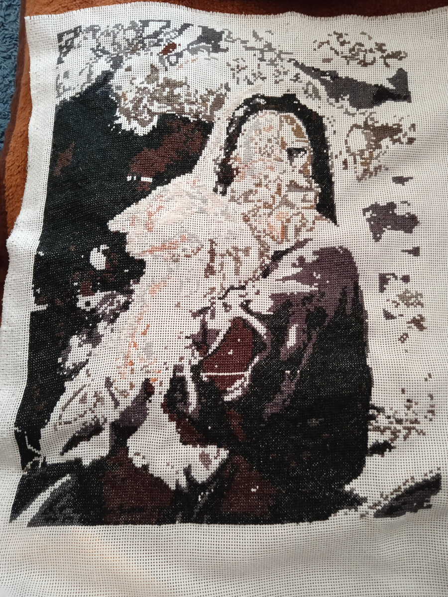 Здравствуйте, уважаемые читатели канала. На этой неделе я вышивала много. Работы вышивались и вышивались, и вот подошло время сделать очередной вышивальный выпуск. Брала я за эту неделю несколько работ. И даже некоторые работы, которые давно не продвигала, я вышивала в эту неделю. Начну со своей основной работы, на которую я потратила больше всего часов. Эта схема из интернета, называется "Дева Мария с Иисусом". Я уже настолько хорошо её продвинулась, что стала видна фигура Девы Марии. Не то, чтобы видно было каждую деталь, но очертания и её, и младенца на руках уже заметны. Работа оказалась очень тёмной, на превью она выглядела посветлее. Но как я поняла, так и предусмотрено. На данный момент работа выглядит так: Вышивала я и свою очень старую работу, Валькирию с мечом (которая в оригинале называется "Серия фэнтези"). Вышила краешек лица и волосы немного, вышила справа и слева немного фона. Вообще, в этой работе предполагается использование брендов. Но там, где можно их не использова