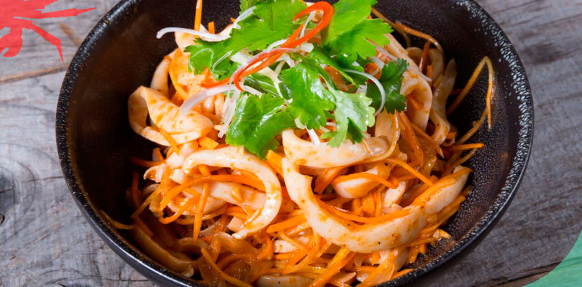 Ингредиенты: Для начала размораживаем кальмаров: перекладываем с морозильной камеры на полку холодильника на бумажное полотенце. Затем промываем под проточной водой и отвариваем в течение минуты. Затем даем им остыть, остужаем, очищаем и нарезаем кольцами. Затем морковь трем на терке. Берем сковороду, разогреваем масло и готовим морковь около 2 минут. Даем немного остыть. Чеснок очищаем от шелухи, измельчаем. Соединяем его с соевым соусом, сахаром, солью, молотым чёрным перцем, кориандром, зирой, молотым красным перцем и уксусом. После чего морковь смешиваем с кальмарами и заливаем маринадом. Затем накрываем пищевой пленкой и убираем в холодильник на 8 часов. Блюдо готово. Приятного аппетита! Источник: https://wildcrab.ru/news?id=2222