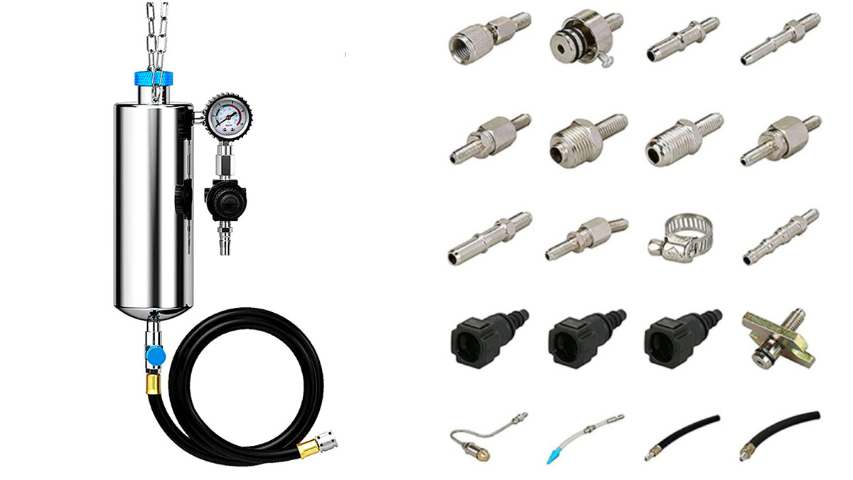 Всем привет, и сегодня мы проведём распаковку и боевые испытания набора для промывки топливных систем AUTOOL C80. Но для начала небольшая предыстория. Десять лет назад нами был приобретён аналогичный инструмент, но от компании KingTool, а именно KA-6780K. Это алюминиевый балон прикручивающийся к стальному основанию, выполняющему роль редуктора, к которому подводится сжатый воздух, вытесняющий из балона жидкость под необходимым оператору давлением, да бы он мог подать эту жидкость в топливную рампу автомобиля. Подробнее о промывке инжектора я уже писал в статье: https://pikabu.ru/story/promyivka_inzhektora_10258536 Но помимо безразборной промывки топливных форсунок (инжектора) непосредственно на автомобилях и промывки топливных форсунок на стенде, аппарат этот используется нами и для опрессовки (проверки герметичности) топливных модулей при их диагностике, либо перед установкой их на автомобиль после ремонта (замены фильтров и насосов). Негерметичность топливного модуля будет причиной