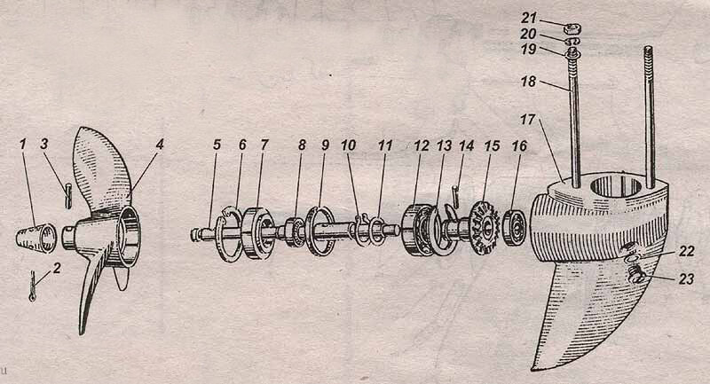 Второй из проблем редуктора ветерка 8, является износ подшипников. Если у Вас валы без износа и хорошие сальники, то такая проблема как замена подшипников Вам страшна будет еще не скоро. Почему страшна? Потому что что бы добраться до редуктора и поменять подшипники, нужно будет скинуть ДВС, разобрать всю ногу и только тогда вы сможете разобрать редуктор и поменять подшипники. Ну а если у Вас все плохо с вала и сальниками и серая жижа как я писал ранее в первой части, будьте готовы их менять. Ибо они могут рассыпаться и поверти, ни чем это хорошим не закончится, тем более на воде. Сперва я отвечу какие подшипники в ветерке 8. Начнем. Начну с того что все подшипники в ветерке 8, а конкретно в редукторе они открытого типа, если вы купили с пластиковыми кольцами по бокам, их будет необходимо снять. Подшипники в редукторе используются. Начну я с вертикального вала. На верху под номером 29 по второй картинке, используется наш советский подшипник 201 или импортный 6201. Некоторые рекомендуют