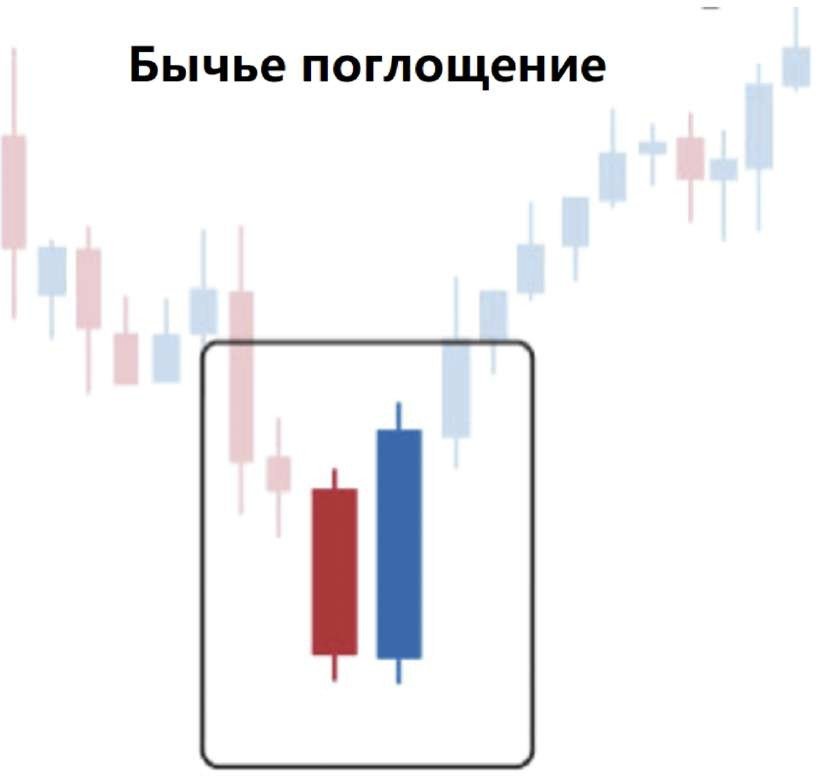 Комбинации японских свечей представляют собой модели или паттерны. Они могут состоять из одной свечи, двух свечек, трех свечек и более. В целом, все они подразделяются на две основные категории: модели (паттерны) разворота, и модели продолжения движения. С этом материале мы начнем знакомиться с самыми эффективными моделями разворота тренда. Открывать новую позицию по сигналу разворота следует только в том случае, если этот сигнал подтверждается дополнительными инструментами анализа кроме японских свечей. Не забывайте, пожалуйста, про это. В частности, нужно знать и понимать, что свечные модели лучше всего отрабатывают у сильных уровней поддержки/сопротивления. Как правильно определять такие уровни, мы затронем в отдельном уроке. В данном материале мы затронем первые 3 бычьих модели разворота. БЫЧЬЕ ПОГЛОЩЕНИЕ Модель (паттерн) разворота «бычье поглощение» формируется в конце нисходящего тренда и состоит из двух японских свечей, первой из которых идет медвежья, а второй бычья. При этом д