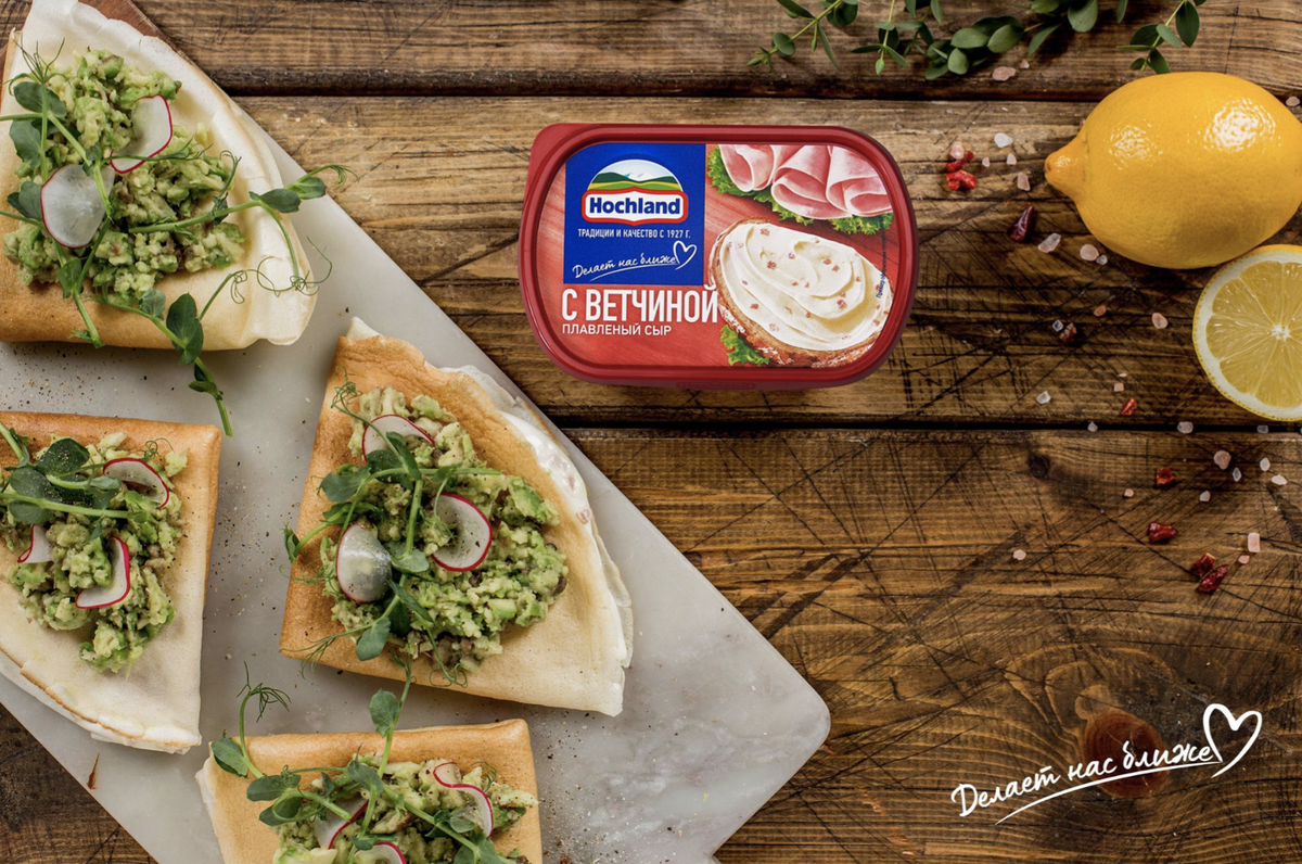 Ничто так не поднимает настроение с утра, как вкусный завтрак. Предлагаем сегодня окунуться в мир положительных эмоций и… блинчиков! Пшеничные, овсяные, ржаные, с припеком и без - они, конечно, хороши и сами по себе, но мы-то знаем, что не меньшее значение имеет начинка! И вот тут в дело вступают сыры Hochland, как плавленые, так и творожные. В сочетании с другими элементами начинок эти сыры создают неповторимую сливочную основу, которая украсит любой выбранный вами вариант. Ну что, вы готовы? 1. Заварные блинчики с начинкой из авокадо и плавленого сыра Hochland «С ветчиной». Здесь мы промазываем сыром блинчик перед тем, как его сложить, а сверху выкладываем пюре из авокадо с лимонным соком (см. рецепт). Нежная, тающая консистенция плавленого сыра с крупными кусочками ветчины придаст таким блинчикам особенно яркий вкус. 2. Блины из смеси нутовой и пшеничной муки с начинкой из грибов и творожного сыра Hochland «Для кулинарии». Творожный сыр Hochland имеет мягкую текстуру, идеальну