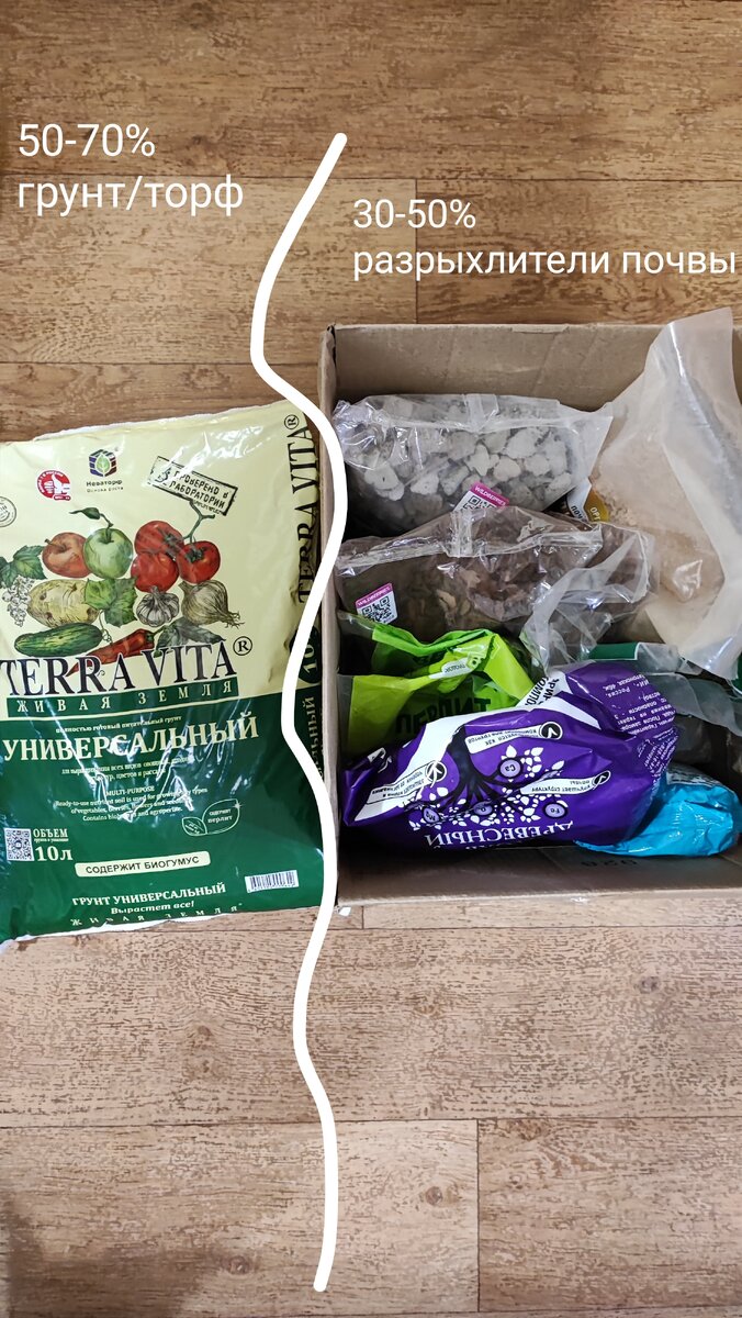 У меня есть универсальный рецепт: 50-70% грунт/торф + 30-50% разрыхлители почвы (лучше 2-4 разных) Какие бывают разрыхлители? Все варианты что использую я представлены на фото. Основная цель этих компонентов Придать почве рыхлости и не дать ей слеживаться в жёсткий пласт. В природе для этого есть жучки, червячки, мышки, кости, листики, корни соседних растений. В горшке же надо это добавить -пеностекло (Можно использовать как дренаж или как компонент почвы. Добавит структуры и воздушных карманов для корней) - мелкая кора (Добавляет рыхлости, аэрации. Подкисляет почву) -цеолит (впитывает влагу и удобрения и постепенно отдаёт в грунт) -диатомит (впитывает влагу и удобрения и постепенно отдаёт в грунт + защищает грунт от насекомых и грибов) -мох и кокосовые чипсы (удерживают влагу, а так же добавляют структуру почве) -речной песок (лучше крупной фракции. Удерживает влагу, поэтому аккуратнее с поливом и лучше добавить его совсем не много) -уголь (компонент который должен быть всегда