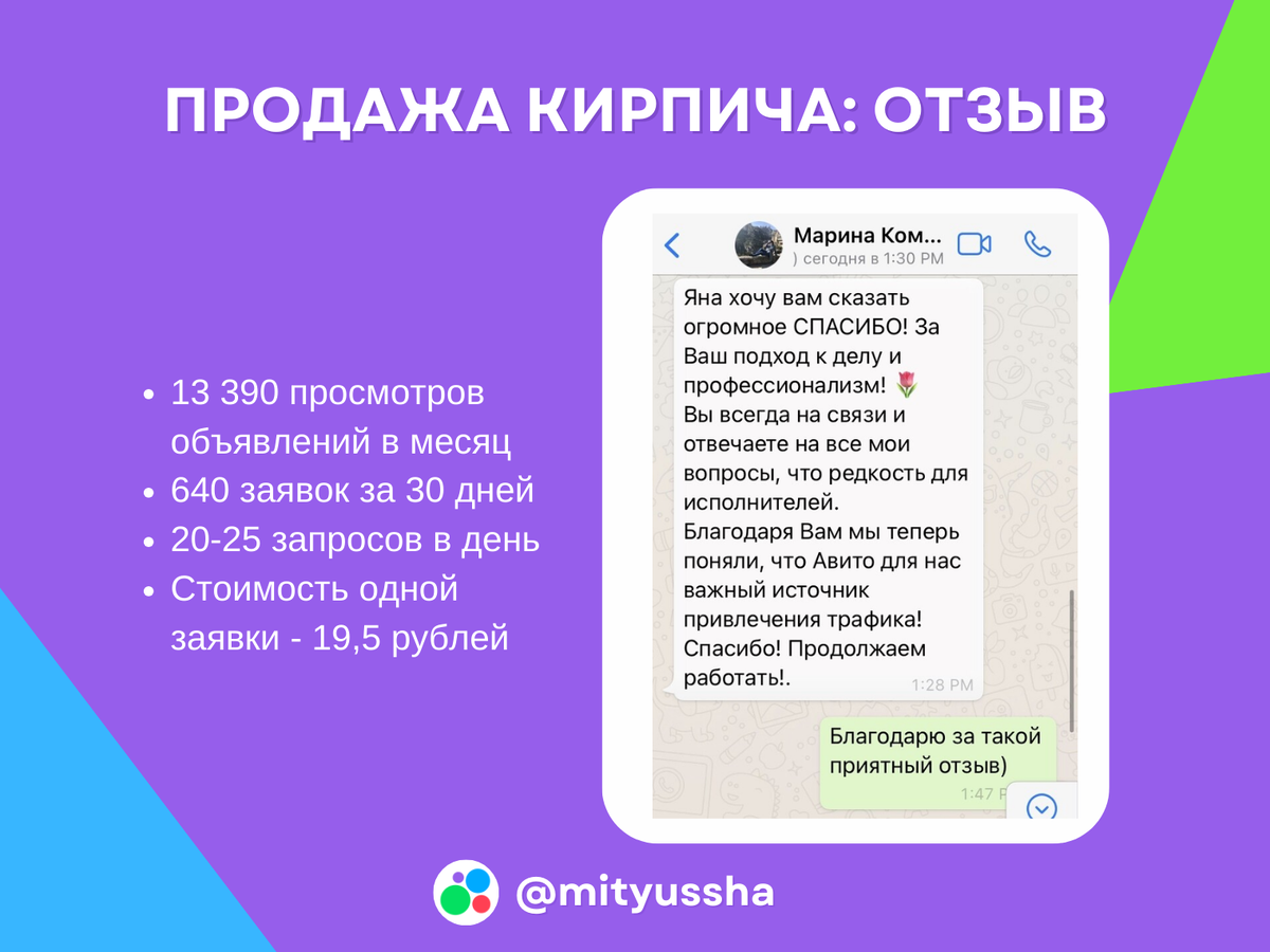 → Мой телеграм — задать вопрос по настройке или заказать консультацию/рекламу на Авито. Задача: Использовать площадку Авито, как способ привлечения клиентов на покупку кирпича на постоянной основе Рекламный бюджет: 12 680 р Цель: Ежедневно получать 3-5 заявок от клиентов с Авито Что было сделано: