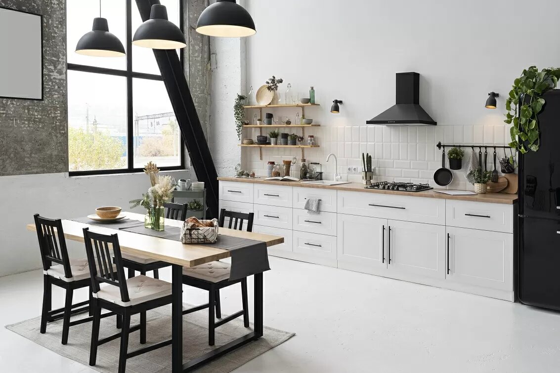Чем больше света на кухне, тем лучше. При установке натяжного потолка нужно протянуть по его периметру LED-ленту. Она станет отличным дополнением к основным светильникам — точечным или линейным. Кроме того, можно провести ленту вдоль ниш, полок и шкафов. Такое решение позволит создать иллюзию того, что кухонный гарнитур парит в воздухе вопреки закону гравитации. В углах можно поставить большие торшеры с лаконичным дизайном.