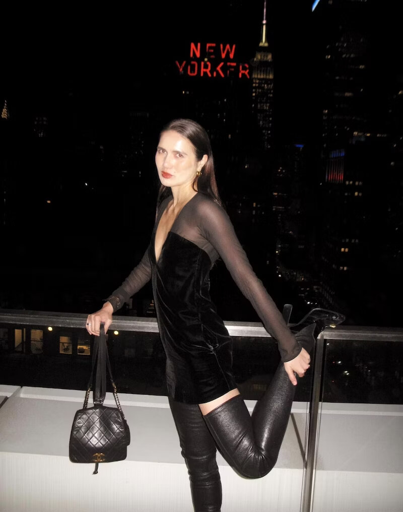 Любители кожи, ликуйте! Ваш сезон настал. Окунитесь в атмосферу байкерского стиля в кожаном мини-платье в стиле 80-х годов и ботфортах. Дополните образ чулками в горошек, чтобы придать ему женственности, и накиньте вязаную шапочку для защиты от морозного ветра.