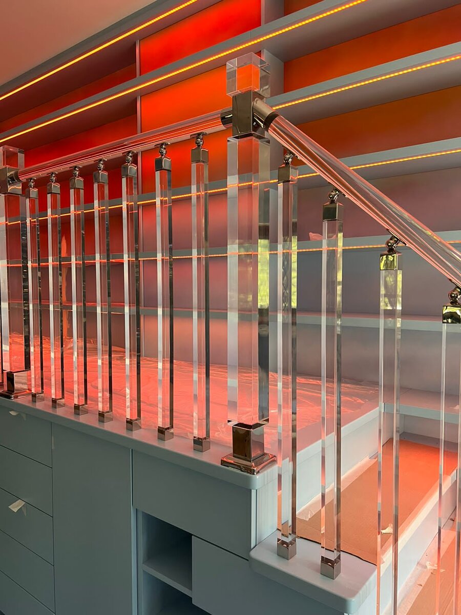 С таким ограждением Ваш интерьер точно удивит ваших гостей 🤩 Материал производства -акриловое стекло. Отличается прочностью, легкостью. Не будет портится, как дерево. Прост в уходе. Благодаря прозрачности пропускает хорошо свет и придает помещению воздушность Стоимость данного проекта составила - 185 тыс с монтажом