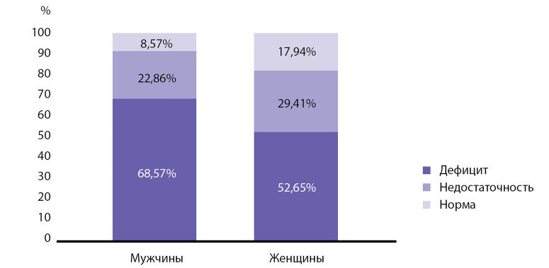 Согласно прошедшему в 2020 году исследованию у большинства граждан РФ наблюдается дефицит или недостаточность витамина D. Вот такую диаграмму можно посмотреть для наглядности. Надо признать, что проблема не просто существует, а вероятно касается каждого из нас. Даже если лично у меня, или лично у вас, нет недостатка в витамине D, скорее всего он есть у близких и родных людей. А значит, касается нас. Чем опасен недостаток витамина D При недостатке, а тем более дефиците витамина D: Подробнее можно почитать: Тут я хочу заострить внимание на одном важном моменте. Дефицит витамина Dпровоцирует некоторые болезни. Но сам по себе витамин D – не лечит. Не стоит воспринимать витамины, как лекарство. Витамины – не лекарство, это просто необходимый компонент пищи. Если витаминов поступает достаточное количество, то организм работает нормально. В том числе нормально болеет, если можно так выразиться. А вот при дефиците начинаются сбои в работе организма. Нормы потребления витамина D Если измерять в
