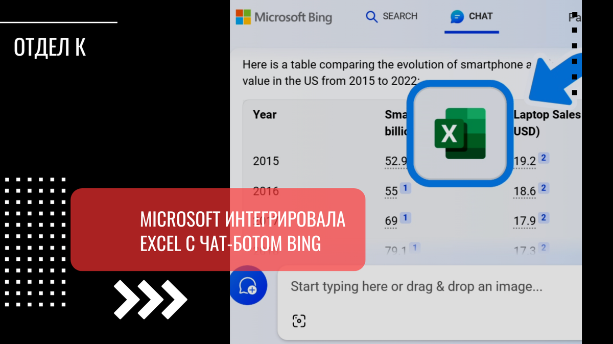 Microsoft добавила функцию интеграции чат-бота Bing с Excel. Пользователи Bing Chat могут попросить чат-бота создать таблицы, которые можно будет импортировать и редактировать в веб-версии Excel. Впервые о новой функции сообщил Пол Куверт. Он привёл пример текстового запроса: «Создай таблицу, сравнивающую динамику стоимостных продаж смартфонов и ноутбуков в США с 2015 по 2022 год». После создания таблицы справа появляется значок «Редактировать в Excel». Нажав на него, пользователь перейдит в веб-версию Excel, где может импортировать данные таблицы из чата в электронную таблицу. Компании, которые используют Microsoft 365 Copilot, также могут использовать Excel с новой функцией генеративного искусственного интеллекта Copilot, хотя она пока находится в общедоступной предварительной версии.