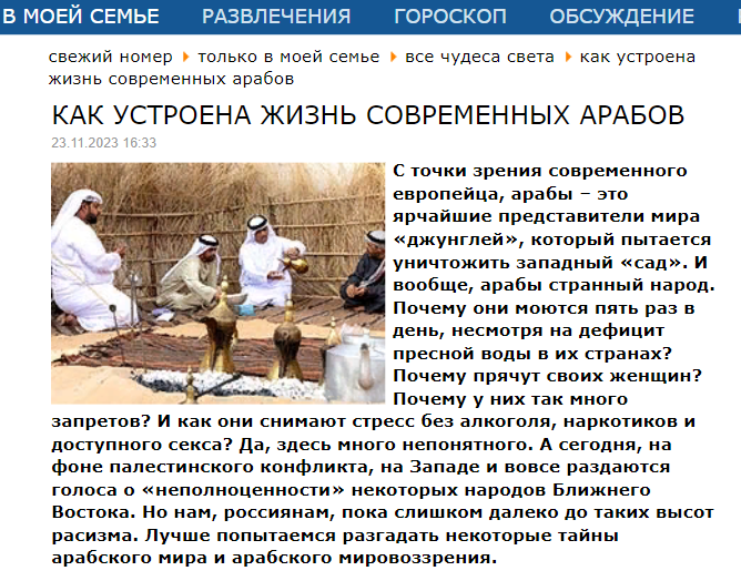С точки зрения современного европейца, арабы – это ярчайшие представители мира «джунглей», который пытается уничтожить западный «сад». И вообще, арабы странный народ. Почему они моются пять раз в день, несмотря на дефицит пресной воды в их странах? Почему прячут своих женщин? Почему у них так много запретов? И как они снимают стресс без алкоголя, наркотиков и доступного секса? Да, здесь много непонятного. А сегодня, на фоне палестинского конфликта, на Западе и вовсе раздаются голоса о «неполноценности» некоторых народов Ближнего Востока. Но нам, россиянам, пока слишком далеко до таких высот расизма. Лучше попытаемся разгадать некоторые тайны арабского мира и арабского мировоззрения.