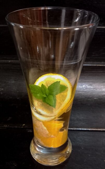 Две три дольки мандарина режем пополам (поперёк)). Лимон (лайм) и листик мяты. Количество и качество добавок дело вкуса (Очень уважаю дольку зелёного манго вместо мандарина). Заливаю примерно ста граммами джина и оставляю на 3-5 минут.