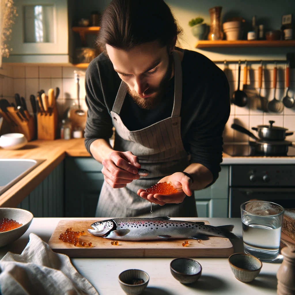 Всё началось с неожиданного улова. В Карелии, где я живу, рыбалка – это не просто хобби, это часть жизни. Но даже здесь, находка в виде трёх больших форелей, купленных моей женой по смехотворной цене, была чем-то особенным. И когда я обнаружил в одной из них икру, я понял, что это шанс возродить воспоминания детства и удивить семью домашним рецептом красной икры. Были времена, когда икра была для меня чем-то обыденным — забавные детские воспоминания о ложках, погруженных в трехлитровые банки красной икры. Но с годами это стало редким удовольствием, доступным лишь на особые случаи. Всё изменилось, когда я нашел икру в свежепойманной форели и решил взяться за домашнюю засолку. Подробный Рецепт Засолки Красной Икры: Погрузите икру на 10 - 15 минут в теплую воду - градусов 55 - 60. Затем руками начните с осторожного извлечения икры, сохраняя целостность икринок. Этот шаг требует внимательности и аккуратности." Промойте икру в слабом солевом растворе, возможно, многократно, до полного уд