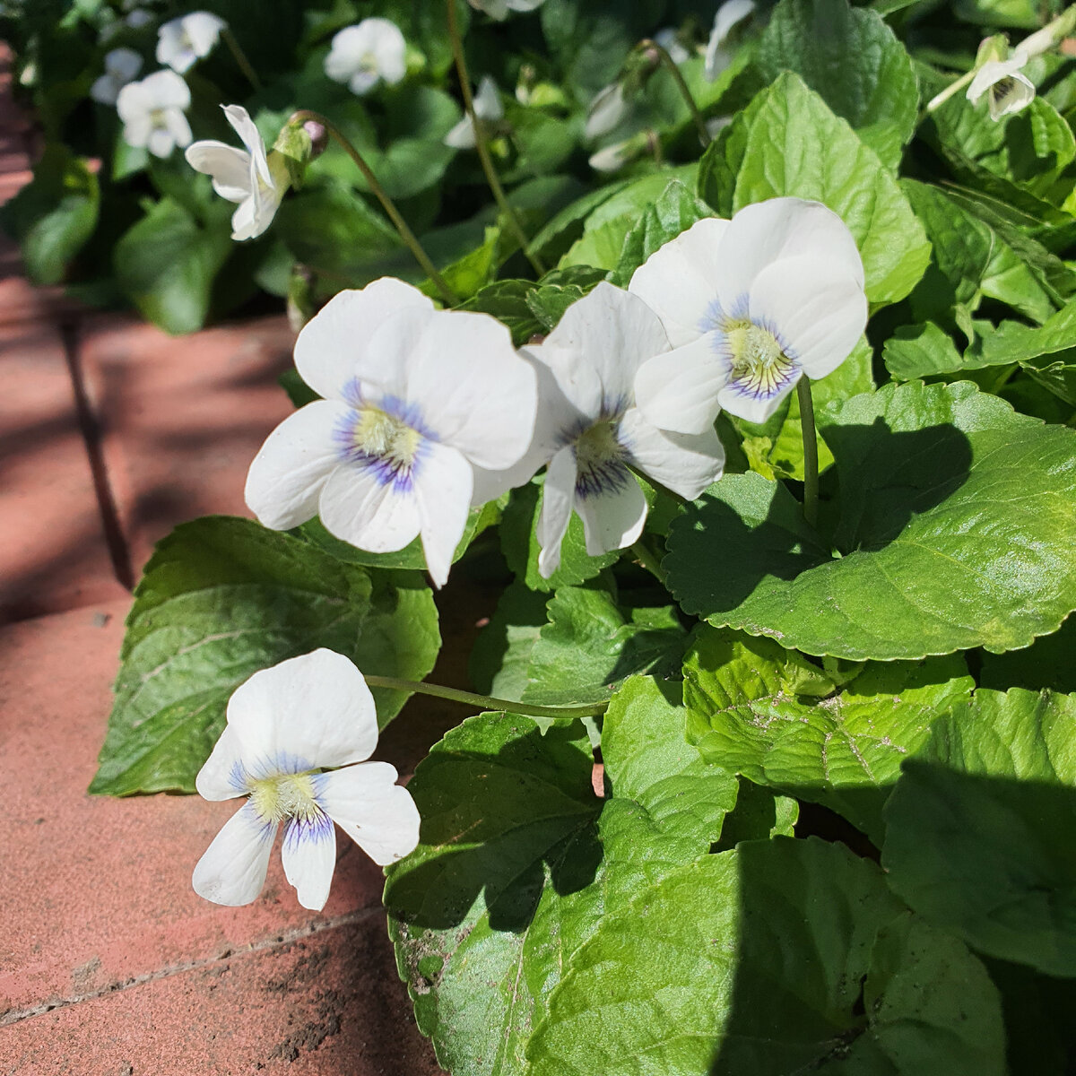 Начнем тоже с белого цвета. Апрельское цветение фиалок усиливается, все их кустики сплошь покрыты цветами-бабочками: