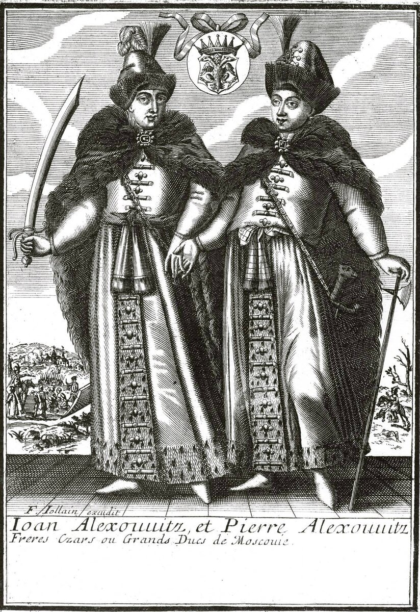 Перед нами французская гравюра, изображающая Петра I и его брата Ивана V. Автор работы – Франсуа-Жерар Жоллен. Это очень редкая картина, единственный экземпляр хранится в архиве Эрмитаже. Почему “Жан” и “Пьер” запечатлены здесь вдвоем? Дело в том, что на протяжении четырнадцати лет братья правили вместе, старшим царем был Иван, младшим – Пётр. Их даже короновали на двойном троне. Гравюра сохранилась благодаря историку искусства и юристу Дмитрию Александровичу Ровинскому, который с 1884 по 1891 годы издал 12 томов «Материалов для русской иконографии». В этих книгах много неожиданных и любопытных изображений русских царей XVI-XVII веков, но наибольшее удивление вызывают именно портреты Петра I, ведь мы привыкли совсем к другому образу. Где хорошо знакомый нам двухметровый исполин, непременно в европейском костюме, с темными кудрями и горящими глазами? А вот, оказывается, как он одевался в юности – старинное русское платье, традиционные меха. Этот стиль повторяется и на других французских