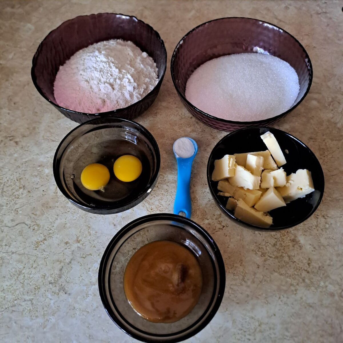 Для приготовления теста понадобится: 2 яйца (категория С0); щепотка соли; 220 гр сахара; 100 гр сливочного масла; 1 ч.л. соды; 400 гр. муки. Для приготовления крема пломбир понадобится: 400 мл молока; 160 гр сахара; 1 яйцо (категории С0); 200 мл сливок (жирность 33-35%); 100 гр масла сливочного; 3 ст.л. крахмала кукурузного. Приготовление коржей: В сотейнике смешиваем 2 яйца с щепоткой соли, высыпаем весь сахар и взбить до однородности. После добавляем сливочное масло, мед и смешиваем до однородности. Ставим сотейник на слабый огонь. Помешиваем массу, доводим до кипения (появление белой пенки). Снимаем сотейник с огня, добавляем соду и перемешиваем. Дальше частями добавляем муку и перемешиваем лопаткой до однородности. Когда тесто начинает остывать, перекладываем его на присыпанный мукой коврик. Замешиваем тесто. Тесто должно получиться мягким и не липнуть к рукам. Готовое тесто делим на 8 частей. Из каждой части формируем колобок. Колобок из теста сложить на тарелку и убрать в холод
