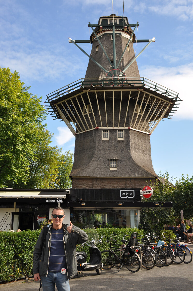 Мельница Молен де Гойер представляет собой одну из шести оригинальных ветряных мельниц, которые сохранились в Амстердаме по сей день. Первое здание мельницы было построено в XVI веке. Во время Нидерландской революции, которая длилась на протяжении 80-и лет, мельница была разрушена и восстановлена только в XVII веке. В 1725 году здание мельницы было перестроено, а в 1814 году, из-за того что новые построенные дома преграждали путь ветру, мельница была перенесена на свое нынешнее место. Окончательную реставрацию мельница перенесла в 1976 году. Сегодня эта историческая постройка делит территорию с Пивоварней Brouwerij`t IJ и привлекает множество жителей города и туристов из других стран. Мельница по праву считается наиболее высокой деревянной постройкой такого типа во всей стране (26,6 метров) и её можно легко увидеть издалека, совершая прогулки по городу. Правда во время нашего пребывания крылья мельницы отсутствовали, возможно их снимают на зиму.