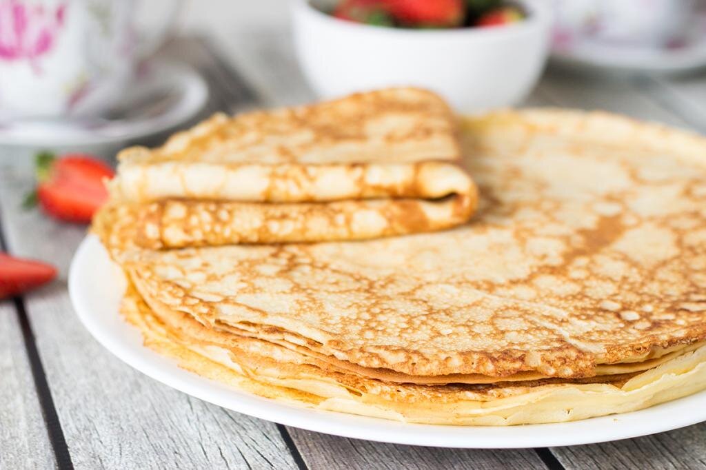 Ингредиенты: - 2 стакана муки - 2 столовые ложки сахара - 1/2 чайной ложки соли - 2 стакана молока - 2 яйца - 2 столовые ложки растительного масла Шаги приготовления: 1. В миске смешайте муку, сахар и соль. 2. В другой миске взбейте яйца, добавьте молоко и растительное масло. Хорошо перемешайте. 3. Постепенно всыпайте муку в яично-молочную смесь, постоянно помешивая, чтобы избежать комочков. 4. Полученное тесто должно иметь консистенцию сметаны. Если оно получилось слишком густым, добавьте немного молока. 5. Разогрейте сковороду на среднем огне и смажьте ее небольшим количеством растительного масла. 6. Вылейте небольшое количество теста на сковороду и равномерно распределите его по всей поверхности. Жарьте блинчики до золотисто-коричневой корочки с обеих сторон, переворачивая их при необходимости. 7. Повторяйте эту операцию со всем тестом, пока не получите нужное количество блинчиков. 8. Подавайте горячие блинчики с медом, сгущенкой, ягодами, орехами или любыми другими добавками по в