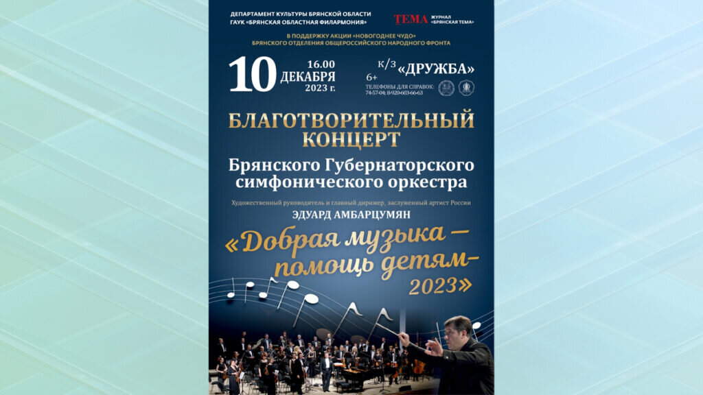 На сцене Брянской областной филармонии состоится Благотворительный концерт Брянского Губернаторского симфонического оркестра «Добрая музыка – помощь детям — 2023». Мероприятие пройдет в воскресенье, 10 декабря. Начало в 16 часов. В исполнение оркестра прозвучит популярная классика отечественных и зарубежных композиторов XIX-XX вв. Стоит отметить, что это уже второй подобный благотворительный концерт. В прошлом году, благодаря поддержке депутатов Брянской областной Думы, Брянского городского Совета народных депутатов и всем, кто купил билеты, было собрано более 500 тысяч рублей. В этом году сбор от проданных билетов снова будет направлен на поддержку акции Брянского отделения Общероссийского Народного фронта «Новогоднее чудо» для детей, попавших в трудную жизненную ситуацию, детей с ограниченными возможностями здоровья, оказавшихся в предновогодние дни на лечении в стационаре, нуждающихся в паллиативной помощи, детей мобилизованных военнослужащих. Возрастное ограничение 6+ В Брянске сос