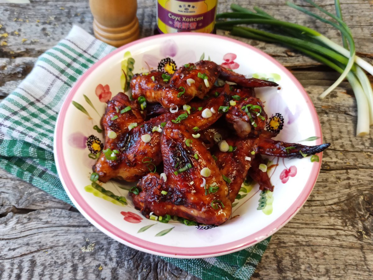 Сегодня у меня блюдо в китайском стиле. На ужин я запекла куриные крылья, маринованные в соусе "Хойсин". Попробуйте и вы. Соус имеет приятный медово-сладковатый вкус с лёгким ароматом дымка. В нём одном столько специй, что других приправ к крылышкам не требуется. Из Википедии: Хойсин готовится из ферментированных соевых бобов, с добавлением сахара, уксуса, кунжутного масла, красного риса (который придаёт соусу характерный цвет тёмного красного дерева), чеснока, мёда, а также смеси "Пять специй" . Также из специй могут добавляться гвоздика, бадьян, зёрна фенхеля и др. Ингредиенты Приготовление: 1. Подготовить ингредиенты. Крылышки помыть и обсушить. Для маринования я взяла соус "Хойсин". 2. В крылья положить соус "Хойсин", сухой чеснок, соль и перец по вкусу. 3. Хорошо перемешать и оставить в холодильнике на несколько часов мариноваться. 4. На противень, застеленный фольгой, разложить маринованные крылья. Полить растительным маслом. 5. Поставить противень в духовку и запекать при темпе