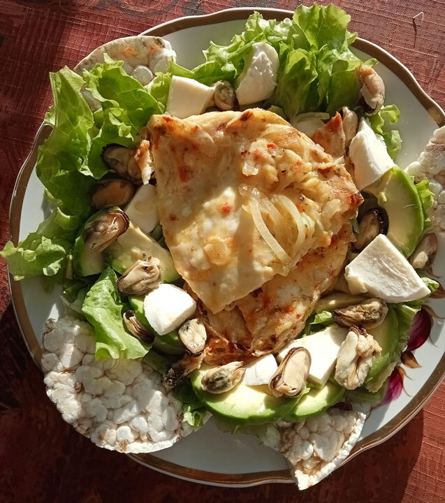 Омлет: ✓ Яйца - 2 шт.; ✓ Молоко - 3 ст. л. (40 мл); ✓ Перец, паприка, соль - по вкусу. Салат: ✓ Сыр моцарелла – 30 г; ✓ Мидии – 70 г; ✓ Авокадо – 40 г; ✓ Листья салата – 30 г. ✓ Заправка: лимонный сок, оливковое масло. Хлебец овсяный – 1 шт. (12 г) КБЖУ - 312/19,1/19,6/9,5. От наших друзей: Вадим Эйленкриг, российский джазовый трубач, на Радио Медиаметрикс Больше общения и рецептов - в группе "Рецепты для диабетиков" в ВКонтакте! Рецепт на странице Автор рецепта – Наталия Мороз © Почтенный возраст Online и Рецепты для диабетиков