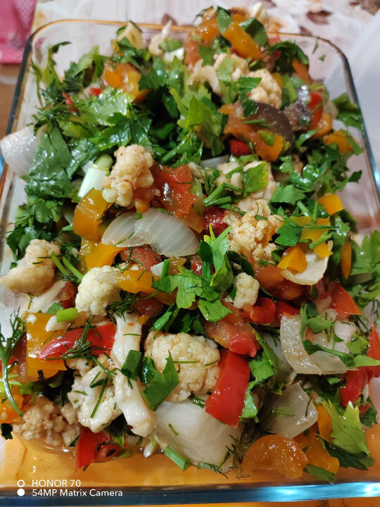✓ Баклажан - 1 шт.; ✓ Лук крупный - 1 шт.; ✓ Помидор большой - 2 шт.; ✓ Чеснок - 2 крупные дольки; ✓ Перец болгарский - 2 шт. (у меня замороженный, 300 г); ✓ Цветная капуста - 250 г; Заливка: ✓ Масло растительное - 25 г; ✓ Уксус 9% - 30 г; ✓ Соль - 8 г; Сахарозаменитель (стевия+сукралоза) - 1 мерная ложечка. Овощи режем средними кусочкам, желательно одинаковым размером. Капусту разделяем на соцветия. Чеснок режем очень мелко. Все складываем в форму. Заливаем заправкой. Накрываем фольгой, и в духовку на 40 минут при 180 градусах. За 10 минут до окончания фольгу можно снять. Как приготовится, добавить рубленую зелень: петрушку, укроп, зеленый лук. Общая масса готового блюда – ок. 1,1 кг. КБЖУ на 100 г – 53,09/1,47/2,53/7,11. + 2 фото От наших друзей: Вадим Эйленкриг, российский джазовый трубач, на Радио Медиаметрикс Больше общения и рецептов - в группе "Рецепты для диабетиков" в ВКонтакте! Рецепт на странице Автор рецепта – Лилия Телешова © Почтенный возраст Online и Рецепты для диабетик