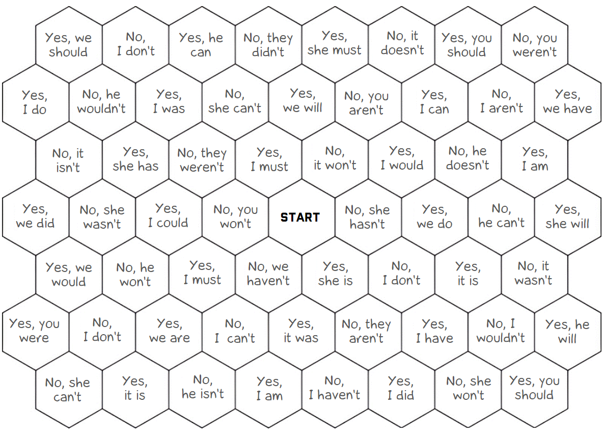 Цель: Устная проработка составления вопросов и кратких ответов в английском. Время: до 30мин. Игроков: 2 Сложность: Низкая Что понадобится: Игровое поле, фломастеры, игральный кубик Как играть: Оба игрока начинают игру с клетки "Start". Игроки поочередно делают ход бросая кубик, если выпало 1/2 - игрок занимает 1 любую клетку от старта, 3/4 - 2 любые клетки от старта, 5/6 - 3 любые клетки от старта. Любая следующая занятая клетка должна соприкасаться с уже ранее занятыми клетками (нельзя телепортироваться). Для каждой закрашенной клетки игрок придумывает вопрос так чтобы подошел ответ, который находится в клетке. Например если в клетке стоит: Yes, I was игрок придумывает вопрос - Were you in the club last night?. Побеждает тот кто занял большую территорию закрашивая клетки.