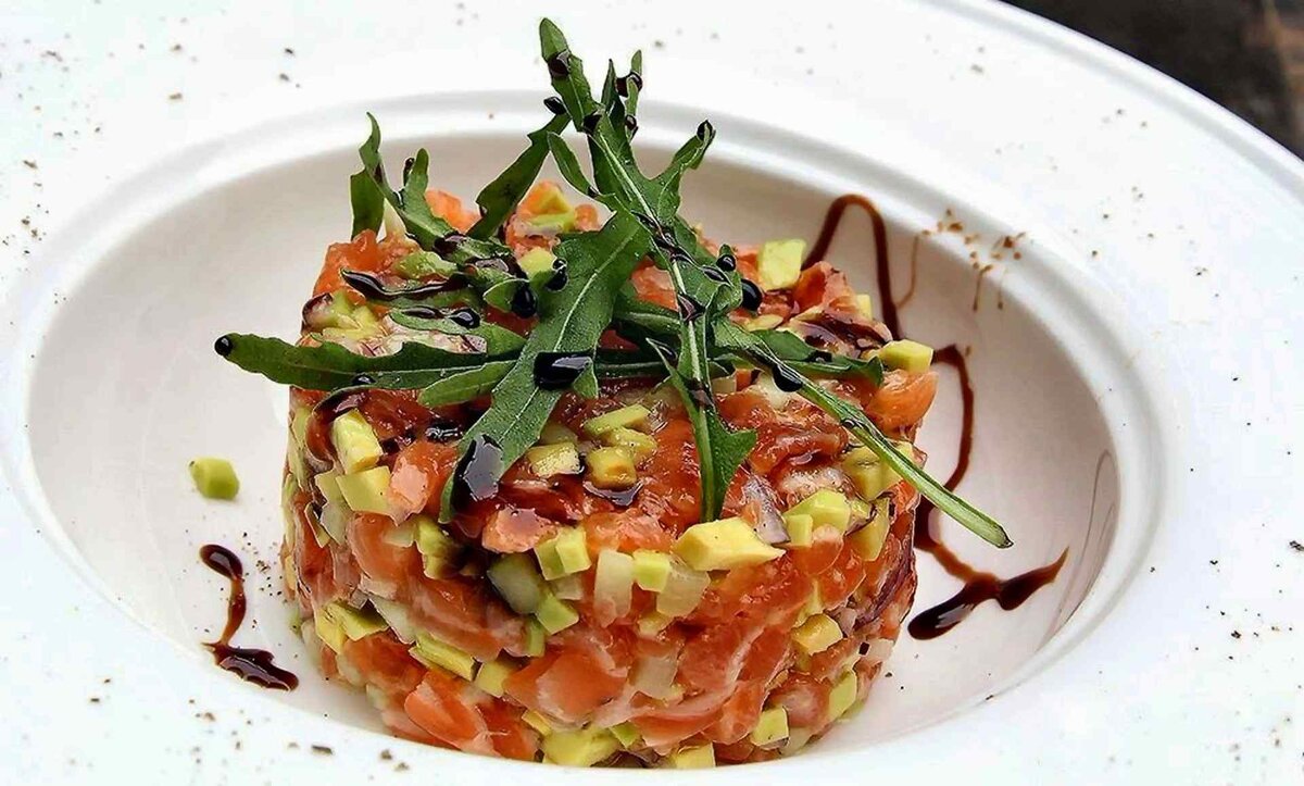 Ингредиенты на 2 порции: Филе лосося, 200 г Авокадо, 100 г Перец чили, 2 г Соевый соус, 10 г Соус «Ворчестер», 2 г Оливковое масло, 4 г Сок лайма, 4 г ПРИГОТОВЛЕНИЕ:
