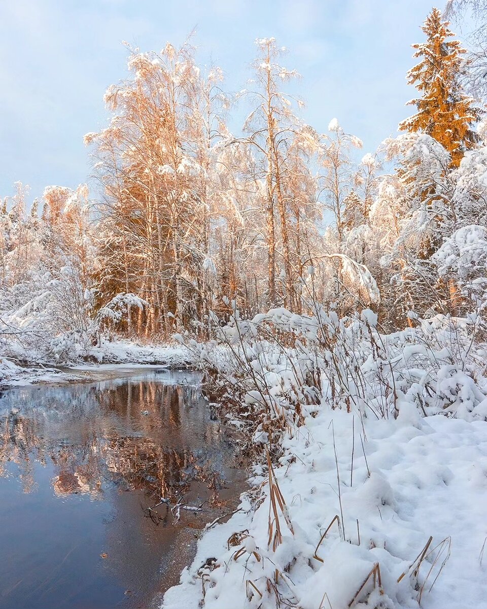 Питерский ноябрь, даже не смотря на прошедшие снегопады, пока не производит зимнее впечатление и выглядит по большей части уныло. Но лучше уж какой-никакой снег в ноябре, чем дожди до января. Радует, что уже который день появляется солнце, - пейзажи за окном стали посветлее и повеселее. Большинство жителей ещё только готовятся к зиме и занимаются своими делами, не подозревая, что в 20 километрах севернее города она уже наступила. Такие переходные моменты в природе последние годы я стараюсь не пропускать. Вот, и в это воскресенье, прихватив с собой лыжи (для последующей тренировки), поехал снимать в знакомые места, которые в снежном варианте до этого ещё не видел. В целом все было красиво и симпатично, но не сильно впечатляло. "Потыкал" карту в смартфоне и решил разведать ещё одну локацию, о чем ни разу не пожалел. Заснеженные берега тихой извилистой речки отлично смотрелись на фоне, подсвеченных закатом, деревьев. У каждой съемочной точки хотелось постоять подольше: полюбоваться мом