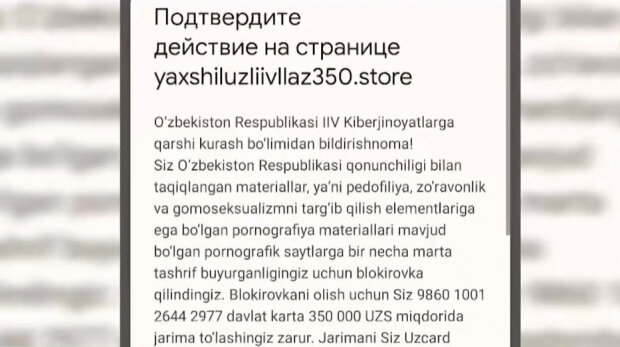 Сотрудниками отдела кибербезопасности УВД Навоийской области было проведено специальное оперативное мероприятие, в ходе которого удалось задержать мужчину, причастного к обману нескольких сотен граждан. Мужчина, который по национальности является украинцем, занимался интернет-мошенничеством, обманывая граждан Узбекистана, которые посещали сайты с порнографическим контентом. При посещении подобных страниц в сети Интернет, потерпевшие получали всплывающее уведомление о нарушении нескольких Законов Республики Узбекистан и блокировке телефона. Кроме того в уведомлении говорилось о необходимости оплаты штрафа, в размере 350 тысяч сум, которые должны быть переведены на счёт банковской пластиковой карты.