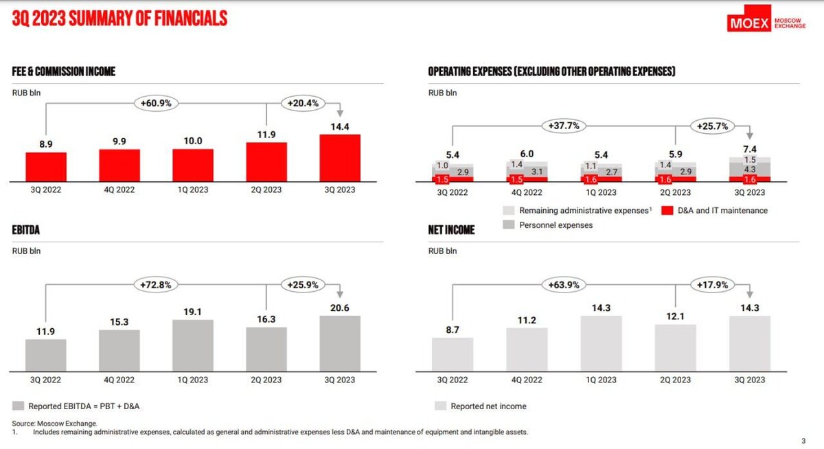 Акции Московской биржи продемонстрировали сильную растущую динамику несколько кварталов подряд. На этом фоне особенно интересно разобрать свежую отчетность компании за 3 квартал 2023 года. Финансовые показатели Биржи выросли практически по всем направлениям. Чистая прибыль составила 14,2 млрд (+63,9% г/г). Рост прибыли обеспечен увеличением комиссионных доходов до 14,3 млрд (+60,9% г/г) и процентных доходов до 11,2 млрд (+21,8%). Самый большой вклад в рост комиссионных доходов внес Рынок акций, доходы от которого выросли в 4 раза г/г до 2,3 млрд. Остальные рынки также показали прирост в 30-70% г/г. @invest_theme #PositiveTechnologiesНа рост объемов торгов влияют несколько факторов – возвращение торговой активности после кризисного 2022 и восстановление стоимости активов. В настоящий момент бизнес в России возвращается к теме IPO, что будет дальнейшей точкой роста комиссионных доходов. Процентные доходы, вероятно, продолжат рост в следующих кварталах. Третий квартал стартовал с ключевой