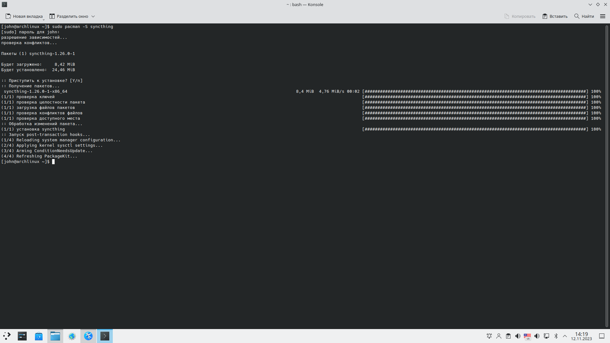 Добрый день дорогой читатель, данное повествование не является истиной в последней инстанции, это некая инструкция по установке (в основном для собственного пользования) Arch Linux (условия таковы, установка с использованием UEFI и файловой системой BTRFS на чистом накопителе) с пояснениями и все возможными мыслями. И так переходим к установки и дальнейшей настройки Syncthing интересная кроссплатформенная программа для синхронизации данных на разных устройствах через сеть(интернет, а так же можно настроить используя только локальную сеть или несколько локальных сетей), может быть кому пригодится в обиходе, приступим... для начала установим нужный нам пакет sudo pacman -S syncthing далее создадим юнит для того что бы программа работала как сервис следующей командой sudo nano /etc/systemd/system/syncthing@.service после внесем в файл следующее содержимое с помощью текстового редактора nano, это настройки запуска программы как сервис то бишь мы написали unit к программе [Unit]