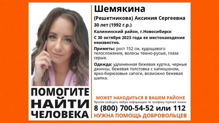 В Калининском районе Новосибирска благополучно завершились поиски 30-летней Аксинии Шемякиной (Решетниковой), местоположение которой было неизвестно с 30 октября 2023 года. В тот день сибирячка вышла с работы, но домой так и не вернулась. Тогда на ее поиски отправились волонтеры поисково-спасательного отряда (ПСО) «ЛизаАлерт». «Найдена. Жива», – кратко написали волонтеры отряда «ЛизаАлерт» в своей официальной группе в социальной сети «ВКонтакте». Напомним, что в различных СМИ писали, что Аксиния развелась с мужем и одна воспитывает девятилетнего сына. Кроме того, по словам ее бывшего супруга, женщина проживала с неоднократно судимым за кражи и угоны мужчиной. Ее сожитель недавно освободился, поэтому многие новосибирцы переживали, что к ее исчезновению мог быть причастен и новый ухажер. К счастью, девушка нашлась, однако, где все это время была Аксиния, пока неизвестно. Ранее «Вести Новосибирск» писали, что в Новосибирске завершили поиски 66-летнего мужчины с усами.