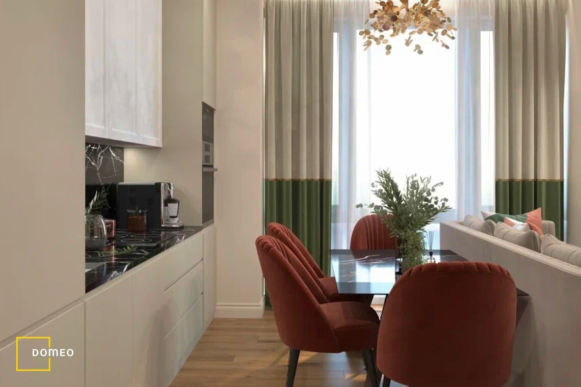 Привет, предлагаю подборку товаров с Wildberries по доступной цене для создания дизайнерского интерьера кухни-гостиной. Подобрал все - от мебели до декора! В интерьере присутствуют яркие акценты благородного терракотового и зеленого цвета. Пример интерьера компании Domeo, который буду воссоздавать. Это 2-комнатная квартира 50 м2. 👇 Подберем предметы мебели и декора для кухни-гостиной. Листайте карусель, если хотите посмотреть весь проект.👇 Планируете ремонт квартиры?👇 ✅РАССЧИТАЙТЕ БЕСПЛАТНО ЗДЕСЬ✅ Начнем с мебели 💥 1. Стул "Оптима" велюр со спинкой для кухни Стулья в этом интерьере являются ярким акцентом. Эти мягкие велюровые стульчики отлично для этого подходят. Цена: 4 822 ₽ Артикул: 168342135 💥 2. Стол прямоугольный раскладной Идеальный раскладной стол черного цвета прекрасно гармонирует с ножками стульев черного цвета. Цена: 5 376 ₽ Артикул: 174090976 Добавим немного текстиля 💥 3. Комплект штор нубук Точно таких штор, как в проекте не нашла, но подобрала несколько вариантов