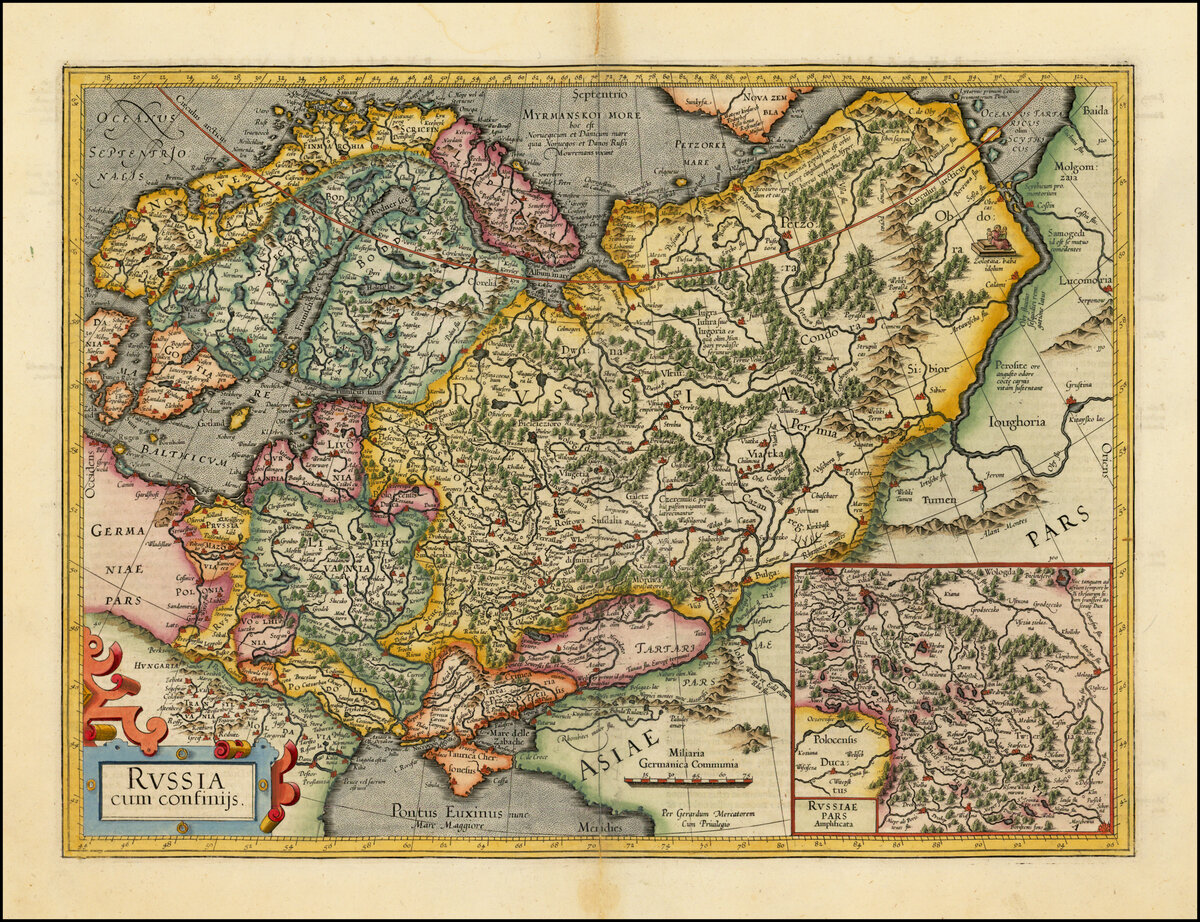 Лучше один раз увидеть, чем тысячу раз услышать, правда ведь? Вот поэтому мы на нашем канале любим периодически выкладывать старинные карты с изображениями нашей страны. Просто демонстрируешь их и легко отправляешь по известному адресу все досужие рассуждения о том, что слово Россия придумал Петр I в 1721 году. Хотим вам сегодня показать еще одну такую карту. На сей раз ее автор знаменитый голландец Герард Меркатор, великолепный картограф и автор плоской проекции земного шара (ну не совсем автор, принцип-то был известен и ранее, но Меркатор его доработал и популяризировал). В 1595-м, спустя год после смерти картографа, вышел в свет его атлас с картами разных регионов мира. В том числе там есть и карта России. Она так и называется - "Russia cum confinijs" (Россия в ее границах). Вот как она выглядит целиком: Подпись в левом нижнем углу видите? Убедились, что перед нами именно карта России? А теперь давайте приблизим карту, чтобы было понятно, какая именно территория так называется. Чтоб