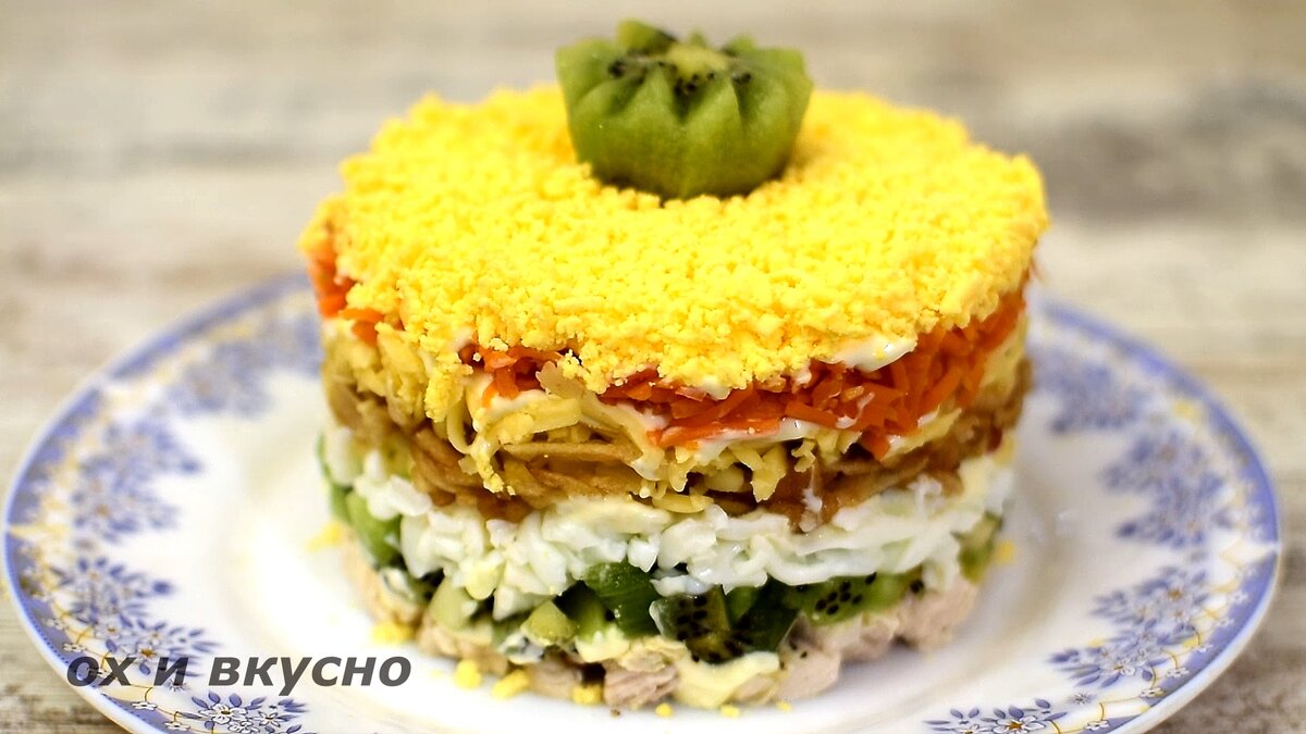 Салат будет слоями и собирать я его буду в кольце диаметром 14 см. Первый слой: отварная куриная грудка(сварена в подсоленной воде), порезанная кубиком. Немного поперчу + сеточка майонеза. Второй слой: киви кубиком Третий слой: яичные белки натертые на крупной терке +майонез Четвертый слой: яблоко натертое на крупной терке Пятый слой: сыр натертый на крупной терке + майонез Шестой слой: морковь по-корейски порезать по-мельче+майонез Седьмой слой(последний): яичные желтки натертые на мелкой терке. Ставлю в холодильник на 20 минут и после снимаю кольцо. Салат получается ярким, сочным, вкусным и если вы любите фруктовые нотки в салатах, то этот салат для вас. Если вам понрав