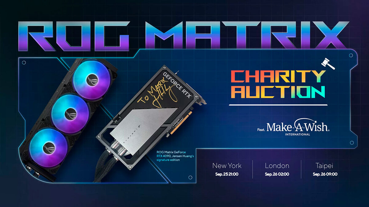 Компания ASUS провела благотворительный аукцион на особенный экземпляр топовой видеокарты GeForce RTX 4090 ROG Matrix. Его особенность личной подписи от самого Дженсена Хуанга – бессменного главы NVIDIA. Цена стартовала с $3200, но быстро улетела.