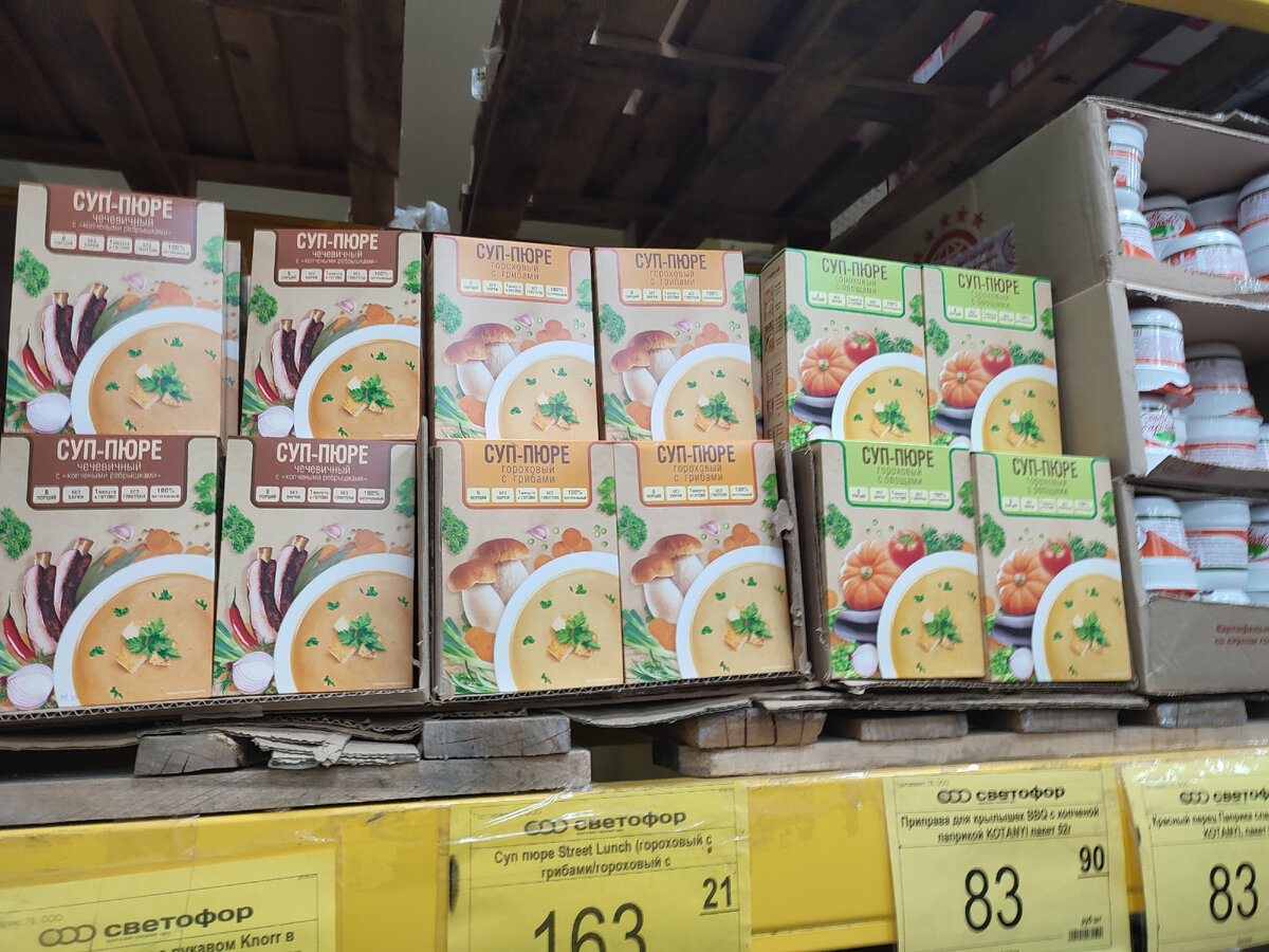 Здравствуйте, мои дорогие читатели. Буквально сегодня утром я опубликовал обзор из Светофора и пообещал, что завтра напишу про суп-пюре за 163 рубля. Но не выдержал театральной паузы и решил сразу же написать про этот необычный супчик в коробочках. Если не читали, то вот эта статья! А я продолжу... Буквально на днях мы заехали в Светофор и увидели этот чудо-суп. Цена слегка нас оттолкнула, но уже в самом конце любопытство взяло вверх над разумом и мы вернулись к этим супам. И ладно бы я слаще морковки ничего бы не ел... но ведь моя жена варит прекрасные супы. Хочется же попробовать что-то новенькое, неизведанное, неизученное)) Вот они стоят на полочке по стойке "СМИРНО")) И так и просятся в вашу корзинку. Я не устоял... но выбор у меня был не велик, с грибами нельзя жене, с овощами не люблю я. Пришлось купить чечевичный с "копчеными ребрышкам". Сказано сделано, купили и потащили домой пробовать Конечно же понравилось, что готовиться он за одну минуту. Состав для такого продукта вполн