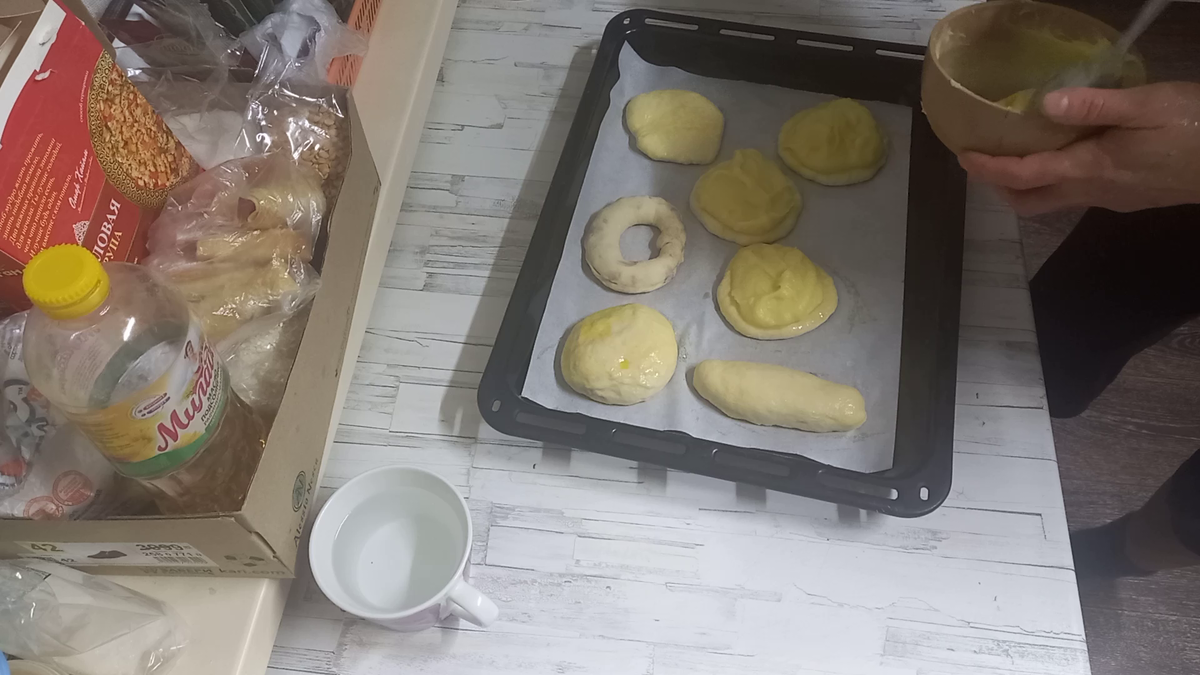 Всем здравствуйте. Меня зовут Ирина. Мы с сыном Денисом иногда проводим экспериментальные проекты на выживание и не только. Сразу скажу, что мы оба работаем и подрабатываем. Наши проекты – это наша инициатива и желание. Данный новый проект - одиночный, в котором участвовать буду только я. Денис уехал в Киров по работе почти на две недели((( Проект будет длиться 14 дней, и я планирую потратить не больше 1500 рублей. День ОДИННАДЦАТЫЙ моего проекта. Проект плавно подходит к завершению))) Я вчера, если кто-то помнит, ставила дрожжевое тесто, и так его и не дождалась, убрала в морозилку. Сухие дрожжи совершенно не хотели бродить, а тесто подниматься. Утром достала его из морозилки и, наконец-то, пошел процесс набухания. Решила сегодня сделать хот дог, баранку с черноплодным вареньем и просто булочку. Своим «соседям» ватрушки с картошкой. Раскатала тесто, сформировала, и в духовку. На баранку также раскатала тесто, выложила черноплодное варенье, завернула и согнула в баранку. Вот фото. Реши