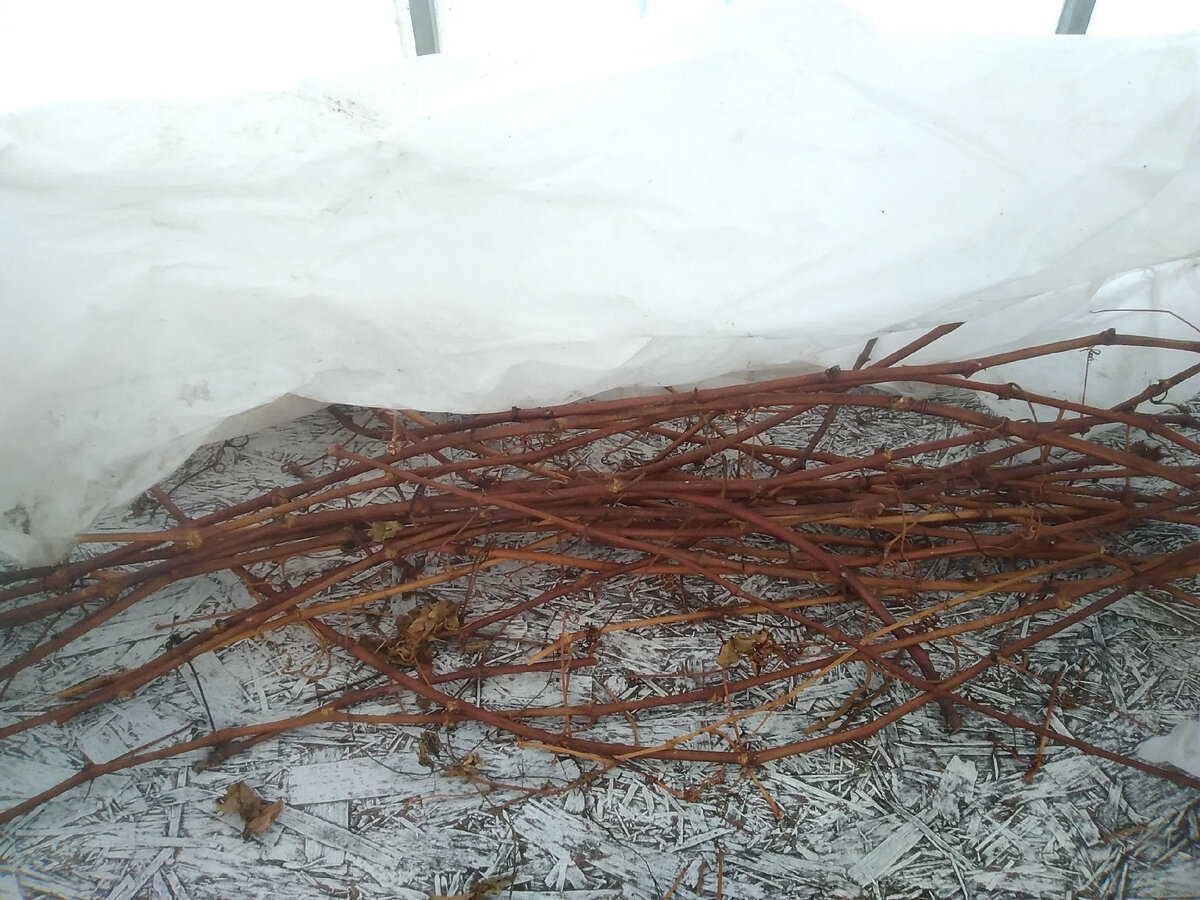 Обрезку лучше проводить после заморозков, когда опадет листва. Но этот год внес свои коррективы - Поздняя весна и холодное начало лета сказались не только на вызревании винограда , но и лозы. Поэтому, в зависимости от сортов, некоторые пришлось обрезать в середине сентября - (Августин - чувствителен к заморозкам) и укрыть в теплице для дальнейшего вызревания. А другие , как Коринка и Альфа, пережили и первые, и пятые заморозки. В ноябре все обрезано. Все уложено в теплицу от холодных проливных дождей для дальнейшей сортировки. С 15- го установилась постоянная минусовая температура. И теперь становится понятно, что пойдет на черенки , а что нет. Верхний образец Августина вызрел Средний приболел -большие пятна. Нижний не вызрел и замерз - бледный с множеством вкраплений. Визуально лозы разных сортов отличаются, но здоровая вызревшая имеет ярче цвет и ровней рисунок. Вот Леон Мийо Верхний вызрел