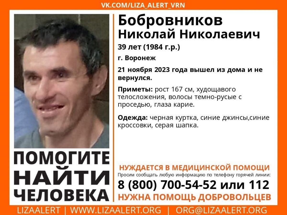 В Воронежской области волонтеры разыскивают без вести пропавшего 39-летнего мужчину. Об этом сообщили в поисково-спасательном отряде «Лиза Алерт». Местонакождение Бобровникова Николая Николаевича неизвестно с 21 ноября. Мужчина вышел из дома и не вернулся, пропавший проживает в Воронеже. Рост пропавшего 167 см, мужчина худощавого телосложения, у него темно-русые с проседью волосы и карие глаза. Одет 39-летний воронежец был в черную куртку, синие джинсы и кроссовки, серую шапку. Воронежцев просят помочь в поисках пропавшего. Если вы знаете что-либо о местонахождении пропавшего, сообщите по телефонам горячей линии отряда 88007005452 (бесплатно по РФ) или 112.