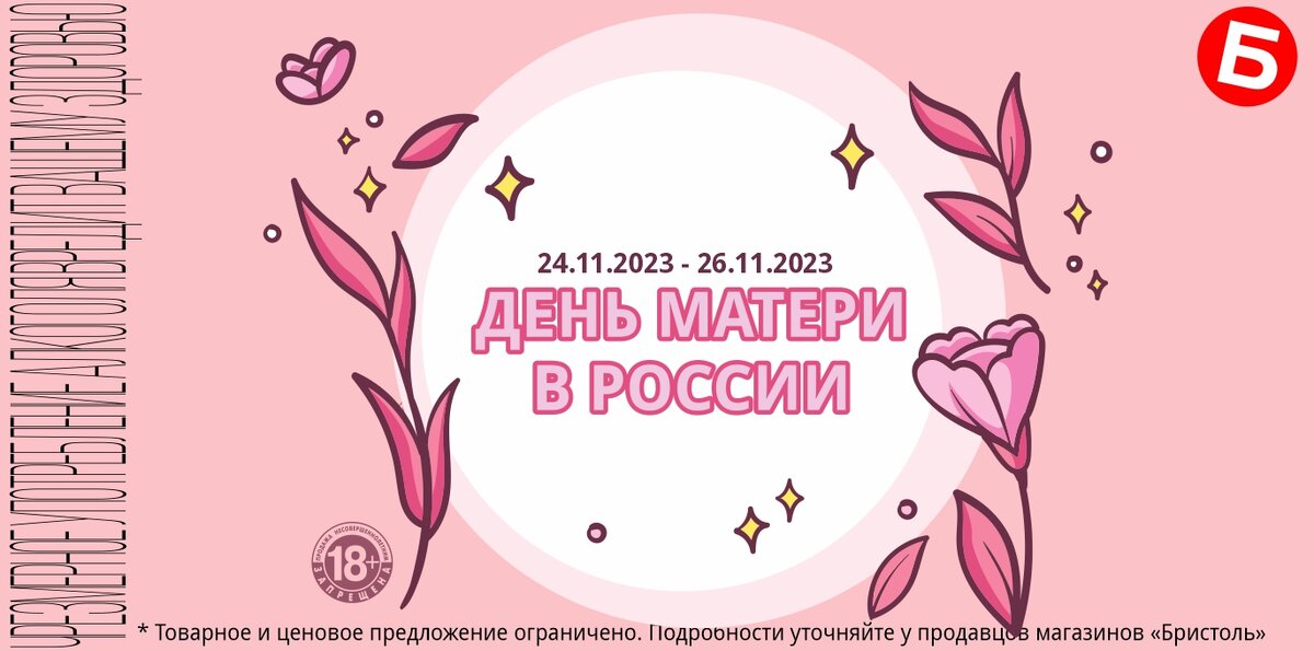 «Мама – первое слово, главное слово в каждой судьбе!» В последнее воскресенье ноября празднуют важный день – День матери! В этом году дата выпала на 26 ноября. Не забудьте поздравить и поблагодарить своих мам за все то, что они вложили в вас! А «Бристоль» поможет с выбором подарка, ведь в период с 24 по 26 ноября 2023 года можно приобрести набор из шоколадных конфет и игристого вина – всего от 350 рублей! Пусть для каждого мама будет близким другом, главным советником и настоящей защитой! *Скидка действует не на все категории товаров, полный перечень товаров со скидкой - уточняйте в магазинах Бристоль; Когда начали отмечать День матери? Празднование Дня Матери является давней традицией, существующей уже множество веков. Отмечать этот особенный день начали древние греки, которые устраивали великолепные церемонии, посвященные Рее - матери всех богов. В Великобритании этот праздник появился в 17 веке, а в Соединенных Штатах - в 1872 году, благодаря усилиям Джулии Уорд Хоув. Первый раз о д