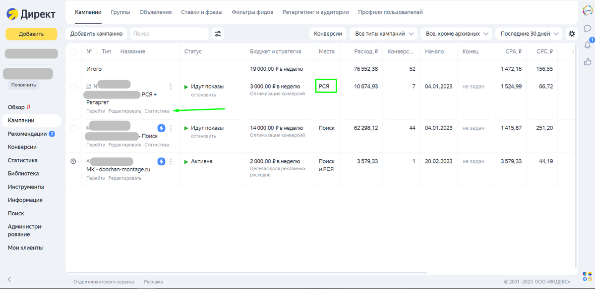 Для этого переходим в кабинет Я. Директ, выбираем любую РСЯ кампанию и переходим в статистику по ней.