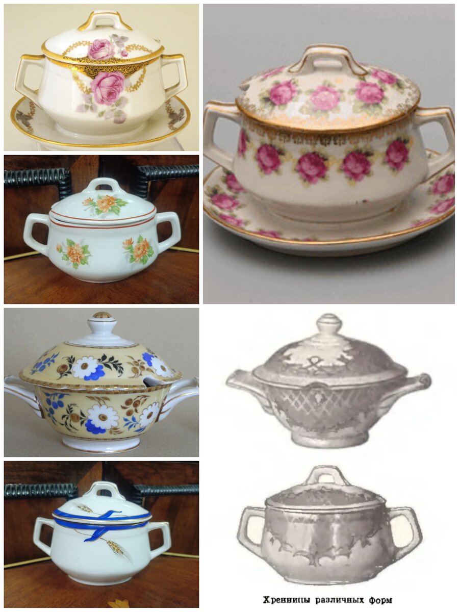 Давайте сегодня рассмотрим такой предмет столового сервиза, как хренница, на примере изделий Дулевского фарфорового завода, основываясь на материалах "Товарного словаря", том lX. По моим наблюдениям в 1930 годы хренницы ещё выпускались на старой дореволюционной форме периода 1880 - 1917гг. Впоследствии форма была изменена, был убран поддон. "ХРЕННИЦА — столовая посуда, предназначенная для подачи к столу хрена. Изготовляется из фарфора, фаянса и стекла. Представляет собой сосуд. Чаще всего цилиндрической формы, с крышкой; иногда и с одной или двумя ручками; в крышке часто делается отверстие для ложечки (рис.). Фарфоровые и фаянсовые хренницы выпускаются и других более сложных форм (шаровидной, грушевидной, яйцевидной, многогранной и др.), а также на поддоне. Стеклянные изготовляются преимущественно методом прессования.Стеклянные хренницы поступают в продажу как штучный товар, а фарфоровые и фаянсовые также в составе столовых сервизов и наборов. Размеры хренниц.: фарфоровых — 200 и