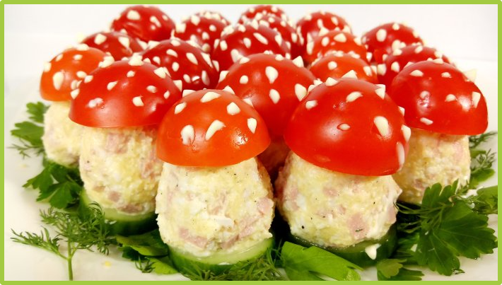 Такое блюдо подойдет для любого праздника: Нового года, 8 Марта, Дня рождения, Юбилея и т.д. Для любого праздничного повода можно легко приготовить этот салат закуску, причем быстро, вкусно и недорого. Ингредиенты: Приготовление Картофель моем, отвариваем "в мундире", остужаем и очищаем от кожицы. Яйца моем и варим вкрутую, остужаем и чистим от скорлупы. Натираем на мелкой терке яйца, картофель, сыр. Очень мелким кубиком нарезаем ветчину или колбасу. Солим и перчим по вкусу, добавляем немного майонеза и перемешиваем. Помидоры, огурцы и зелень моем и даем им обсохнуть. На блюдо раскладываем зелень. У огурцов обрезаем кончики и нарезаем их "шайбочками" толщиной 8-10 мм. Раскладываем огурцы на блюдо поверх зелени, и формируем "ножки" из салата, выкладывая из на огурцы. (Салат должен получиться густой и клейкий). Сначала катаем шарики из салата, затем придаем немного вытянутую форму. Сверху салат слегка приплюснуть. Помидоры режем на половинки, срезая плодоножку. Чайной ложкой удаляем жид