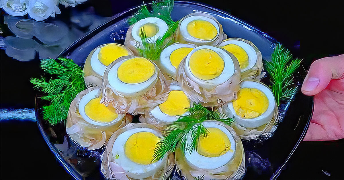 Подав к столу нарядный холодец с яйцами, вы обязательно получите славу самой лучшей хозяйки. Так как это блюдо очень сильно отличается от классического заливного. Во-первых, такой холодец подается порционно. Во-вторых, он выглядит очень оригинально благодаря разрезанным отварным яйцам. Такую шикарную подачу холодца ваши гости точно еще нигде не встречали. Не упустите момент. Удивите близких таким роскошным блюдом и подайте его к праздничному столу вместо традиционного заливного. Как приготовить нарядный холодец с яйцами Помните, что перед варкой мясо необходимо залить чистой водой. Выдержите его в жидкости в течение 3 часов. За это время мясо сможет очиститься от крови, которая затем не будет портить бульон сгустками. Ингредиенты Приготовление ; ; ; ; ; ; Достаньте холодец из формочек. Поместите его на большое блюдо. Присыпьте холодец с отварными яйцами измельченным свежим укропом. Потом уже можете нести его к столу и получать заслуженную похвалу своим стараниям и кулинарным умениям.